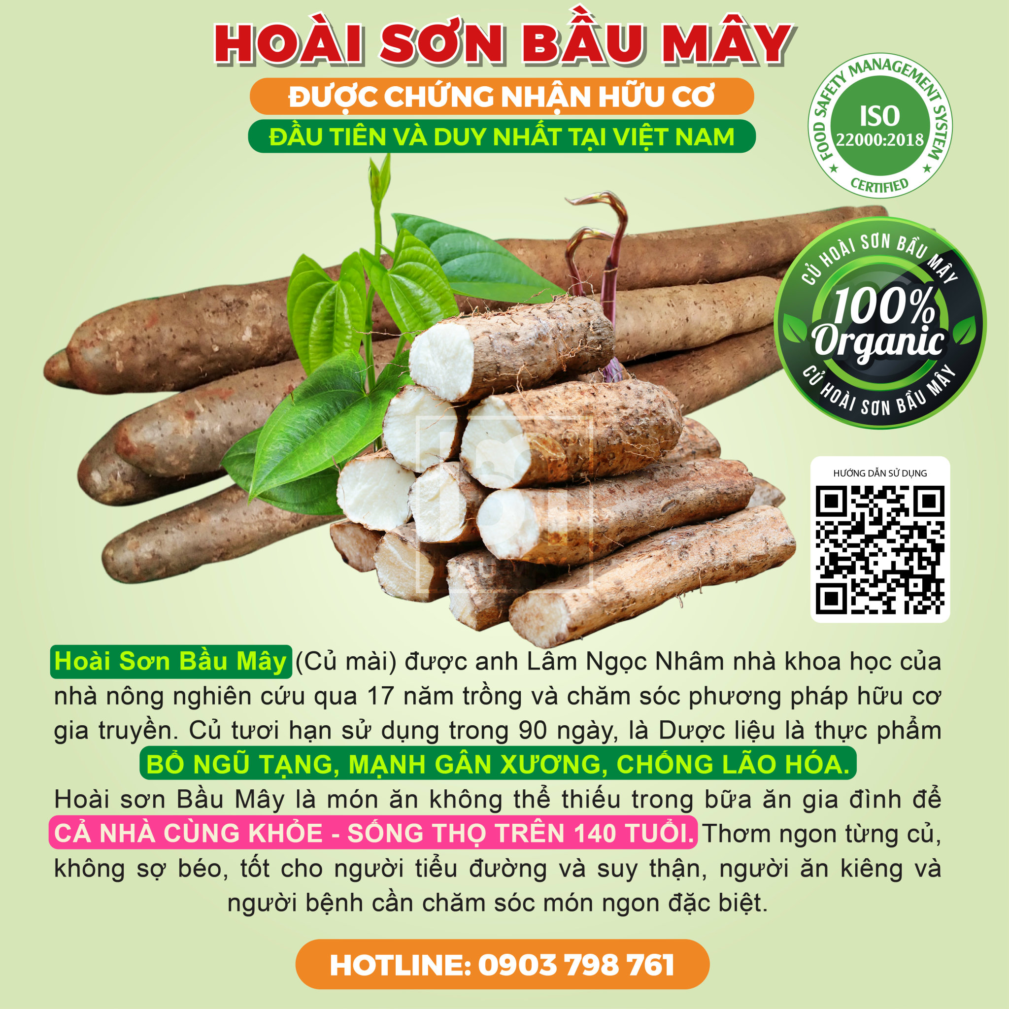 Củ Hoài Sơn Bầu Mây được chứng nhận đạt chuẩn hữu cơ đầu tiên và duy nhất tại Việt Nam, do ông Lâm Ngọc Nhâm nhà khoa học của nhà nông nghiên cứu trực tiếp qua hơn 16 năm trồng theo phương pháp hữu cơ gia truyền và theo tiêu chuẩn ISO 22000:2018.