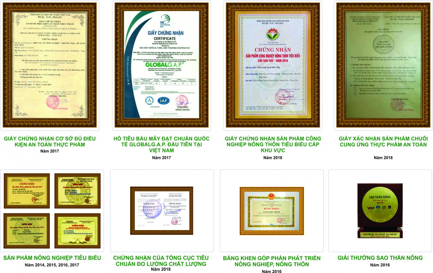 Hơn 20 năm phát hiện, chăm sóc và nắm bắt từng hơi thở cây tiêu Bầu Mây, với bản lĩnh mạnh dạn đổi mới cách chăm sóc, đón đầu những công nghệ mới, bản lĩnh đột phá, phát huy tính sáng tạo. Hồ tiêu Bầu Mây trở thành điểm sáng trong nền Nông nghiệp Việt Nam. Hợp tác xã Nông Nghiệp - Thương Mại - Du Lịch Bầu Mây đã trở thành 1 trong những Hợp tác xã hàng đầu tại Việt Nam về sản xuất Hồ tiêu, đóng góp lớn vào sự phát triển của nền nông nghiệp nông thôn Việt Nam. Với những thành tích nổi bật đó, Hợp tác xã Nông Nghiệp - Thương Mại - Du Lịch Bầu Mây đã vinh dự đạt được các chứng nhận và danh hiệu cao quý: